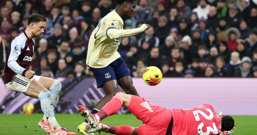 ¡Gooooool! Aston Villa 0, Everton 1. Thierno Barry (Everton) remate con la izquierda a quemarropa desde el lado izquierdo a la escuadra derecha.